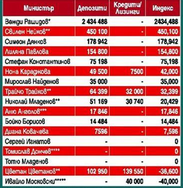 Вижте в таблицата какви влогове имат министрите на Бойко (Геноцида) - нагли и богати, ако бяха бедни нямаше да са нагли. На последното заседание на Министерския съвет Борисов обяви българите за богати и мързеливи, защото имали пари на влог, не работели и в същото време потреблението паднало, защото не купували. Днес стана ясно, че Геноцида е говорел най-вече за себе си и своите министри. Погледнете таблицата и си правете изводите.
