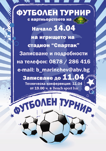 Снимка Организаторите Спонсори на турнира са: Спорт бар Бенч, дискотека VERTU, дискотека VERSAI, бира Gallagher, коктейл бар Cheers, бира Каменица, бира Tuborg. |