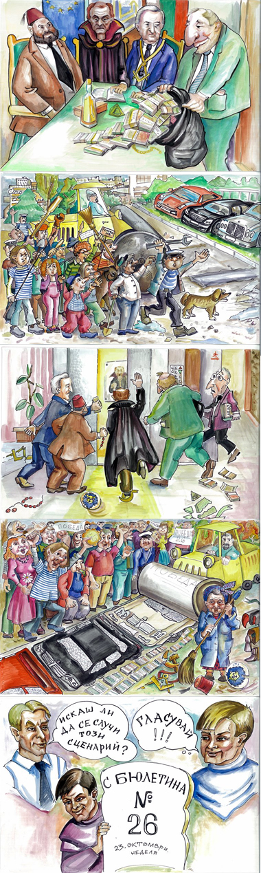 Карикатури http://www.facebook.com/anton.lukov.kmet?sk=wall Във Фейсбук бяха пуснати тези карикатури. Дали са в полза на Антон Луков или са автогол ти оцени, достатъчно си интелигентен. Докато провалени политици подкрепиха кандидат-кмет без шанс за кмет Магарето обиколи днес Виница, където живеят 16 000 варненци. Около 20 от тях се снимаха със живото магаре Марко. Подробности и снимки ще видите по-късно. Само ще допълня, че Минчо и Григор от Виница са много повече човеци от провалените политици, тоест нечовеци Капон и Касим Дал. |